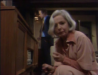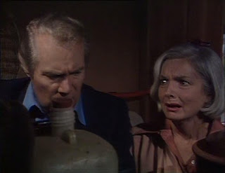 Back to “During Barty’s Party”: Roger and Angie Truscott (Anthony Bate, Elizabeth Sellars) are an older married couple who reside not-so-contently in the countryside. Returning home late from the office, Roger finds Angie frantically unnerved due to the combination of what she suspects was an afternoon nightmare and the possible threat of an idling automobile parked just outside their home. (Roger reasons the car’s just packed with teenagers-on-the-make, but a more sinister rationale is later offered.)